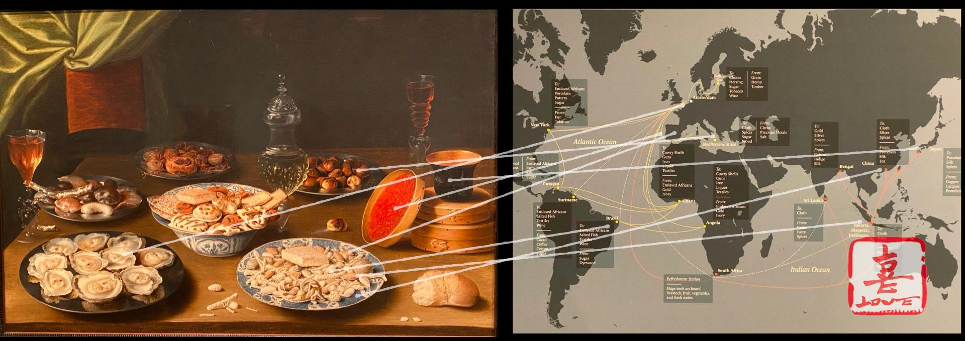就像上次课程里说的,盘子是中国进口的,糖是巴西奴隶种植园产出的,其他所有东西都来自世界各地,有南美洲、南亚、中国、欧洲其他国家,汇集到荷兰人的早餐桌上、点心桌上,成为我们称之为四五百年前的一种全球化,由海洋时代展开。
